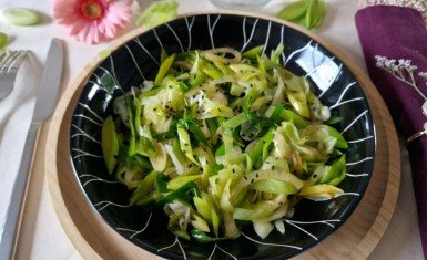 01- Éliminer les feuilles vertes des poireaux, enlever la première feuille afin de ne garder que les parties tendres. Bien les laver. Les fendre en quatre et les couper en rondelles.