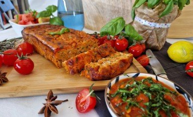 03 – Mélanger le poisson haché, le basilic, les œufs, les 2/3 restant du coulis de tomates. Rectifier l’assaisonnement. Graisser un plat avec l’huile d’olive et y verser la préparation.