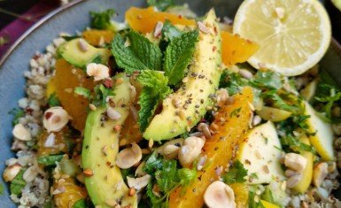 - Dans un grand saladier, mélangez le quinoa refroidi avec 1 avocat coupé en dés, des morceaux de pommes, des éclats de noisettes (ou noix, amandes) des segments d’orange et de pamplemousse. Ajoutez de la menthe (ou la coriandre ou ciboulette) cisellé.